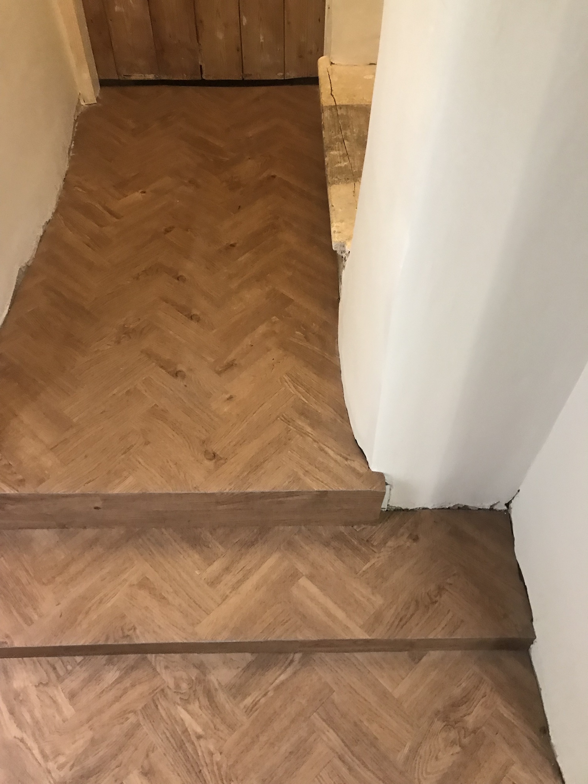 Private residence in South Shields. The client required the whole of the ground floor to be screed. Then to fit evocore in herringbone throughout the hallway and living room. In the kitchen and downstairs tile effect was required. This product required a full stickdown.