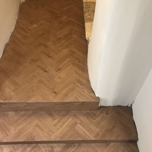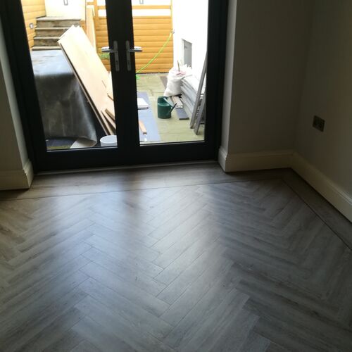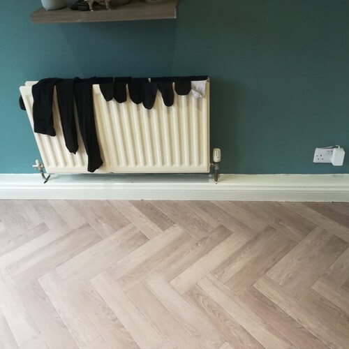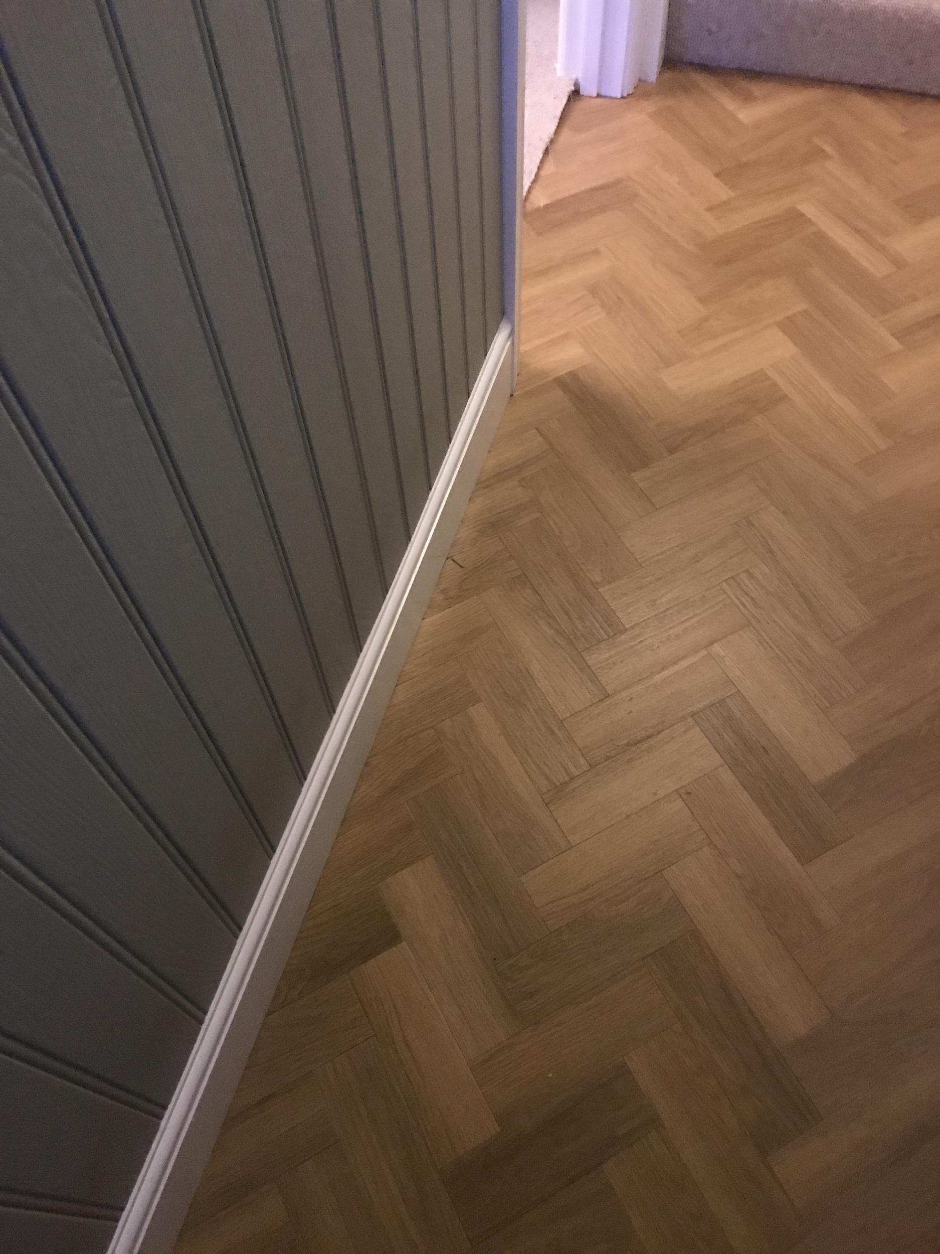 Private residence in Bishop Auckland. The client picked LG Hausys parquet flooring in stonewashed birch on a 6mm plywood base with a full stick down.