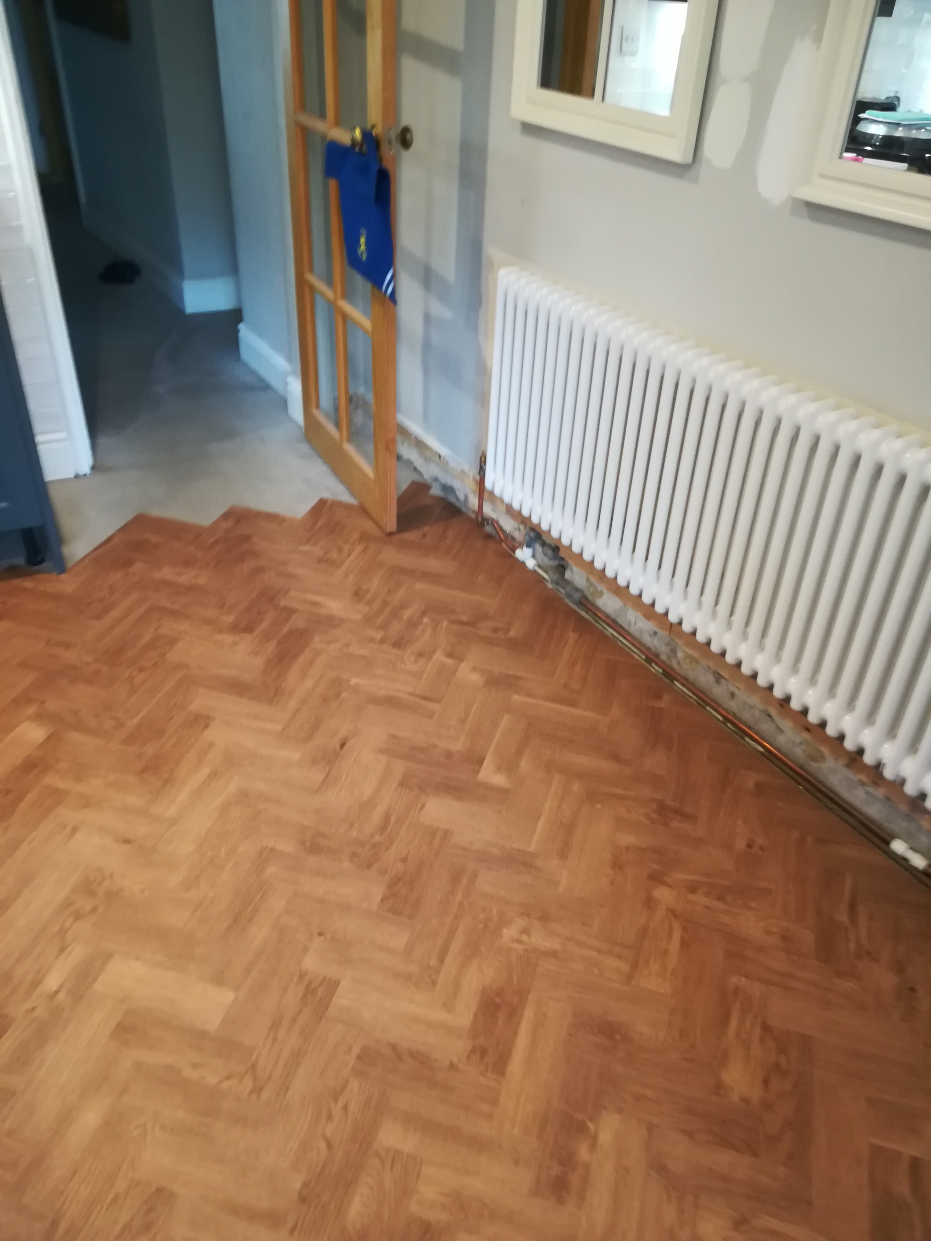 Residence in low fell. The preparation was 9mm plywood in the lounge to bring the level up to the same as in the hallway. The client supplied the Karndean flooring to be laid in a herringbone pattern in the kitchen/diner , hallway and lounge.