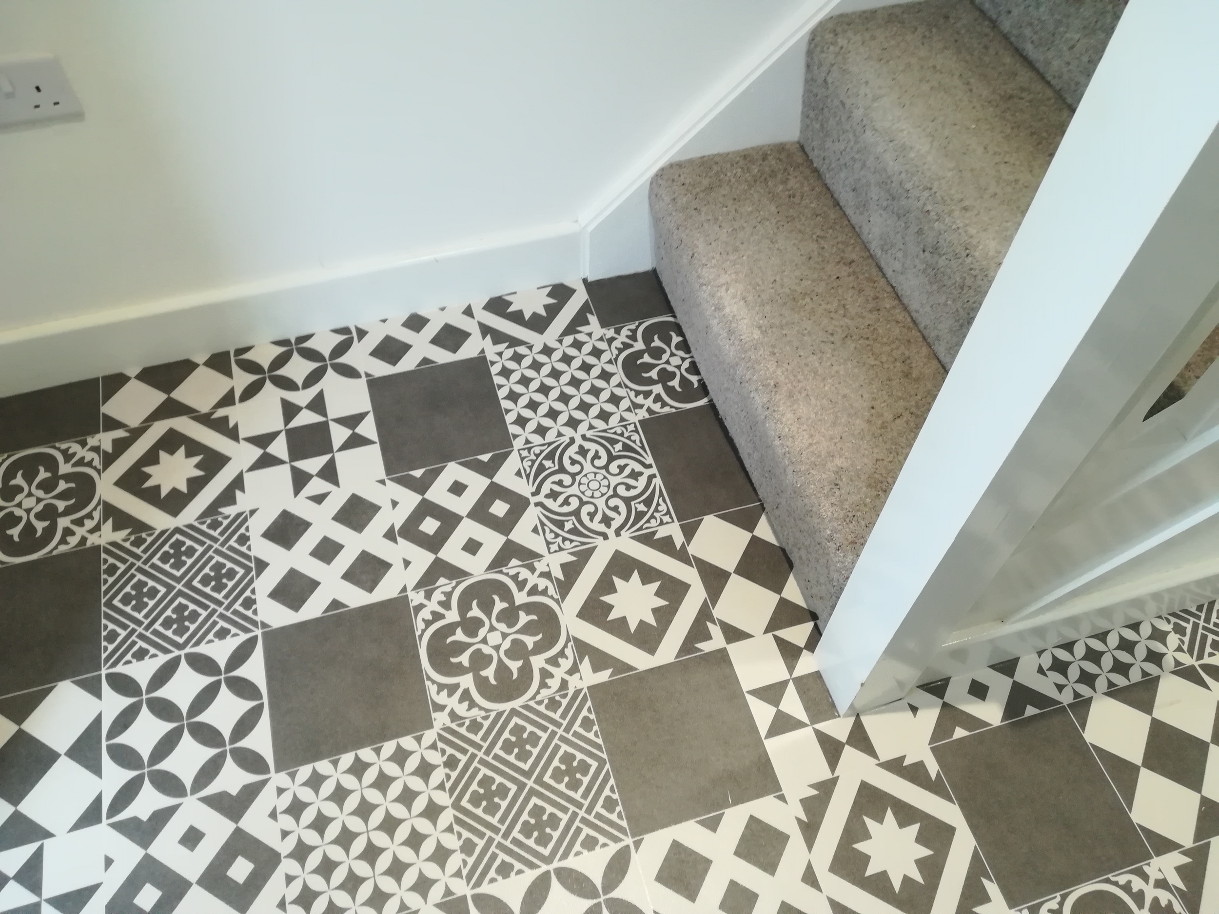 Client: Private residence in Bishop Auckland. Project: Fit vinyl in the hallway and to match the pattern of the vinyl to the risers on the staircase. To fit carpet to the treads on the staircase and to the half landing and top landing.