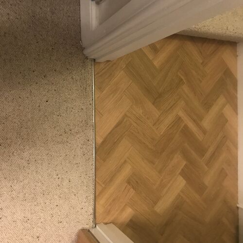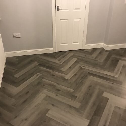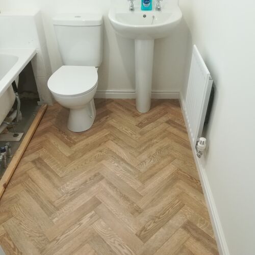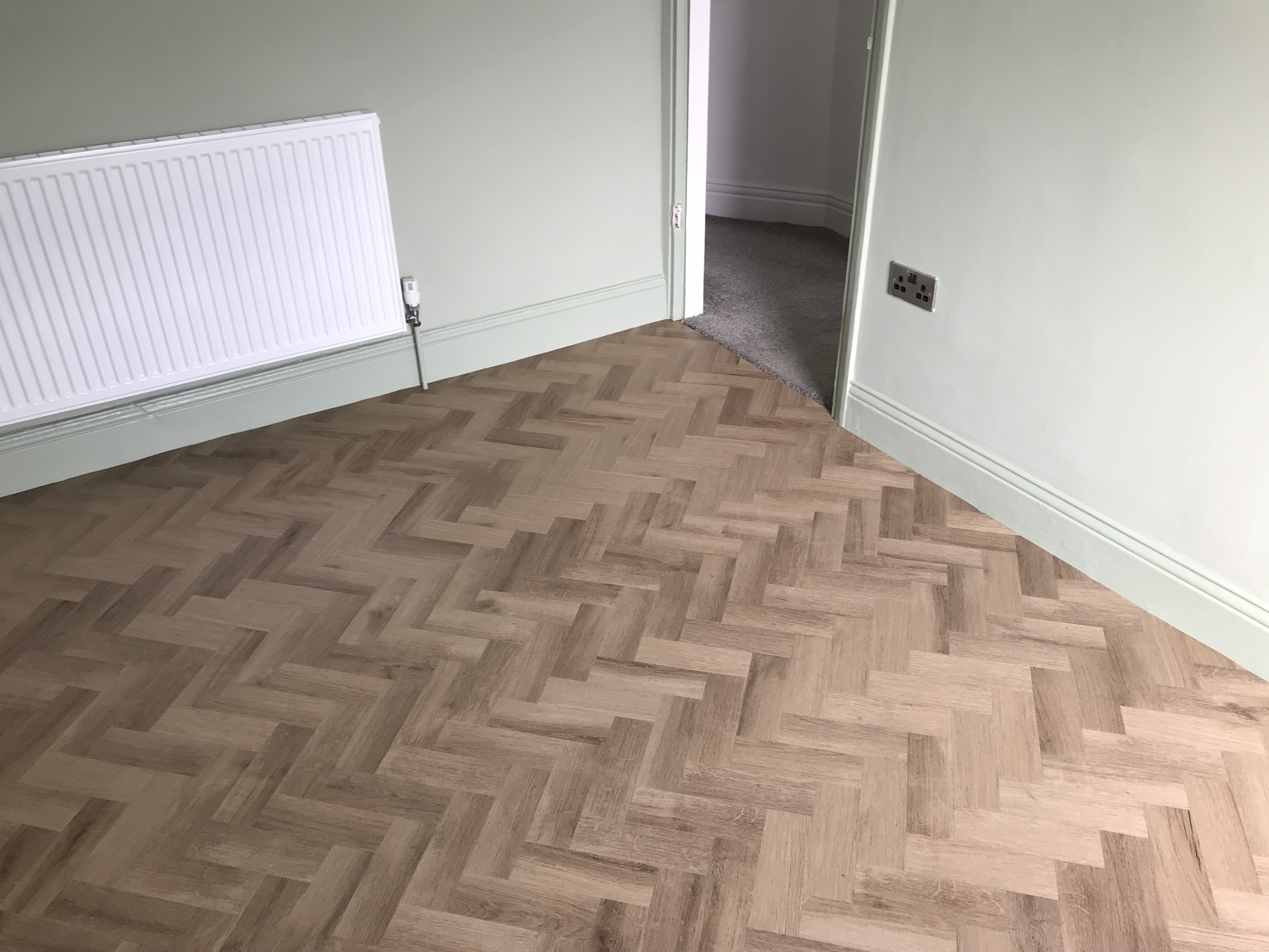 Private residence in Stanley. The client required the whole of the ground floor to be primed and screed. Then to supply and fit Polyflor parquet with a full stick down. The client also required the flooring to flow through the whole of the ground floor with no breaks in the door ways. To complete the look the client supplied herringbone vinyl to be fitted in the upstairs bathroom and en-suite.