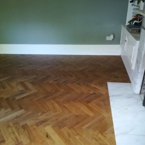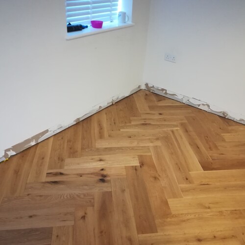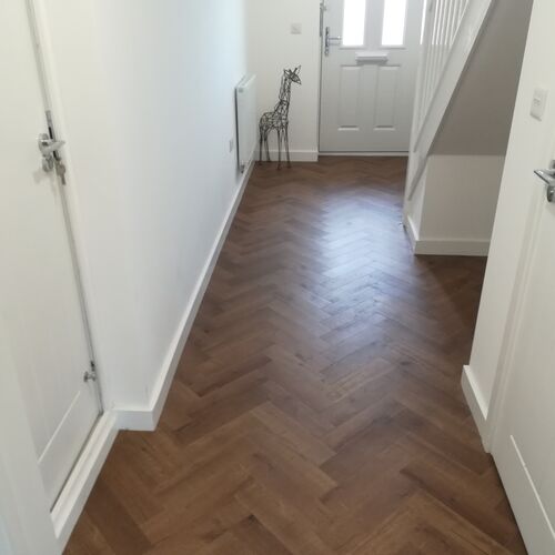 Residence in Consett. Client required floor to be ply and then screed. Then herringbone flooring laid.