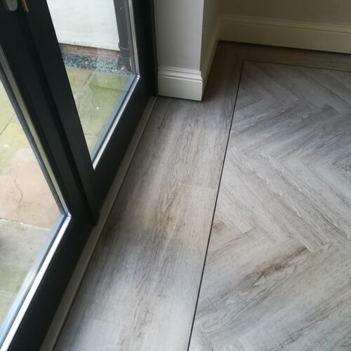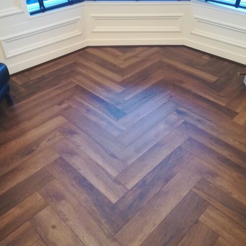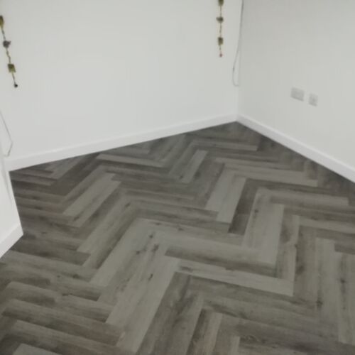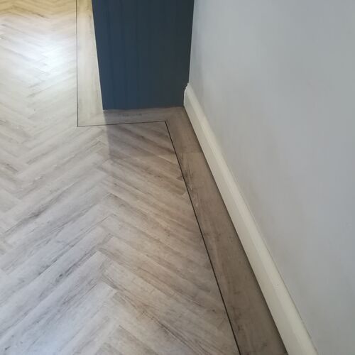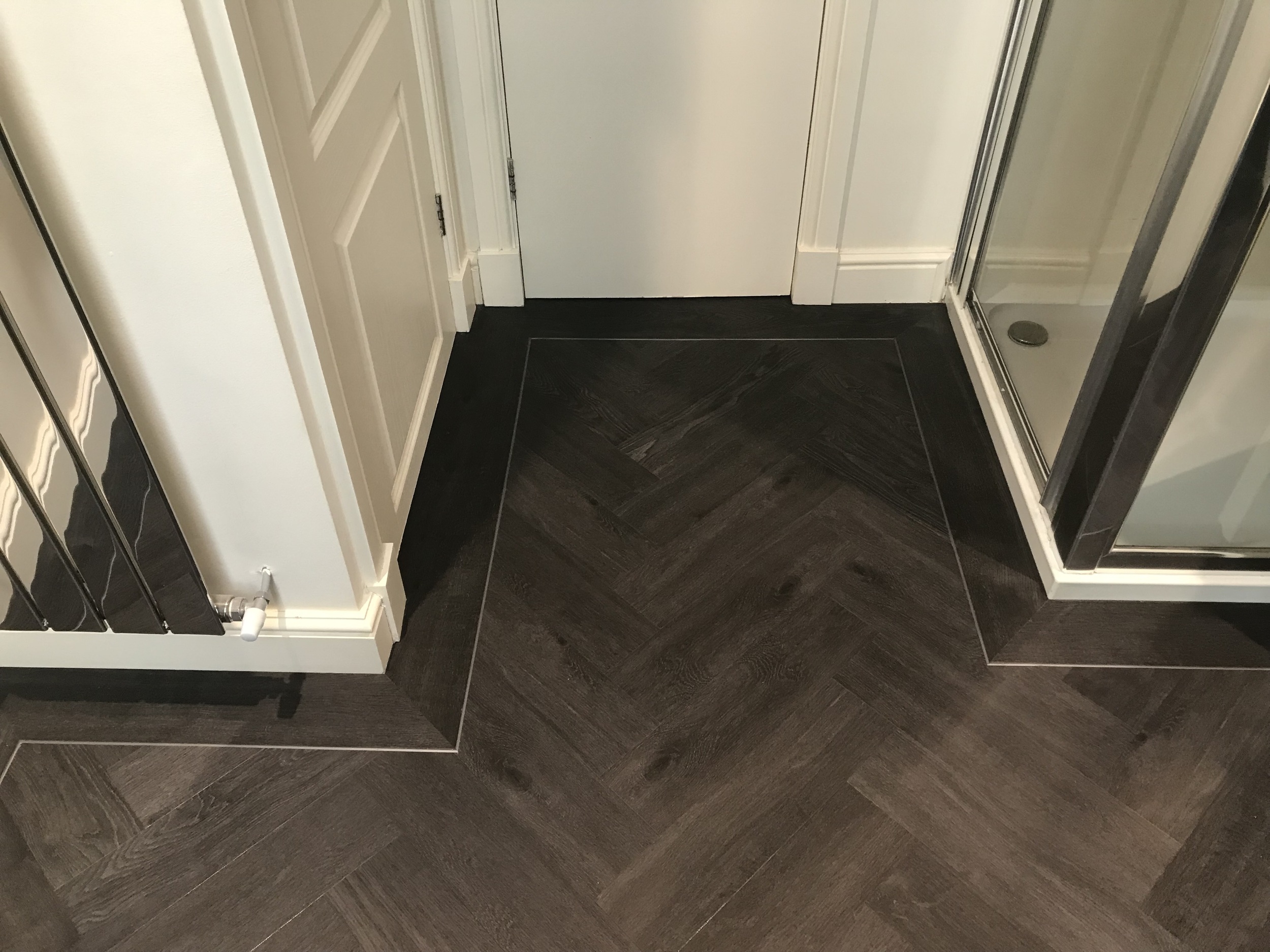 Residence in Chester le street. Client required uplift of the old flooring. Then 6mm flooring grade plywood was laid. The client choose Lk Hausys in fumed timber with a large plank for the border with a silver feature strip. To finish the look a large herringbone plank for the infill.