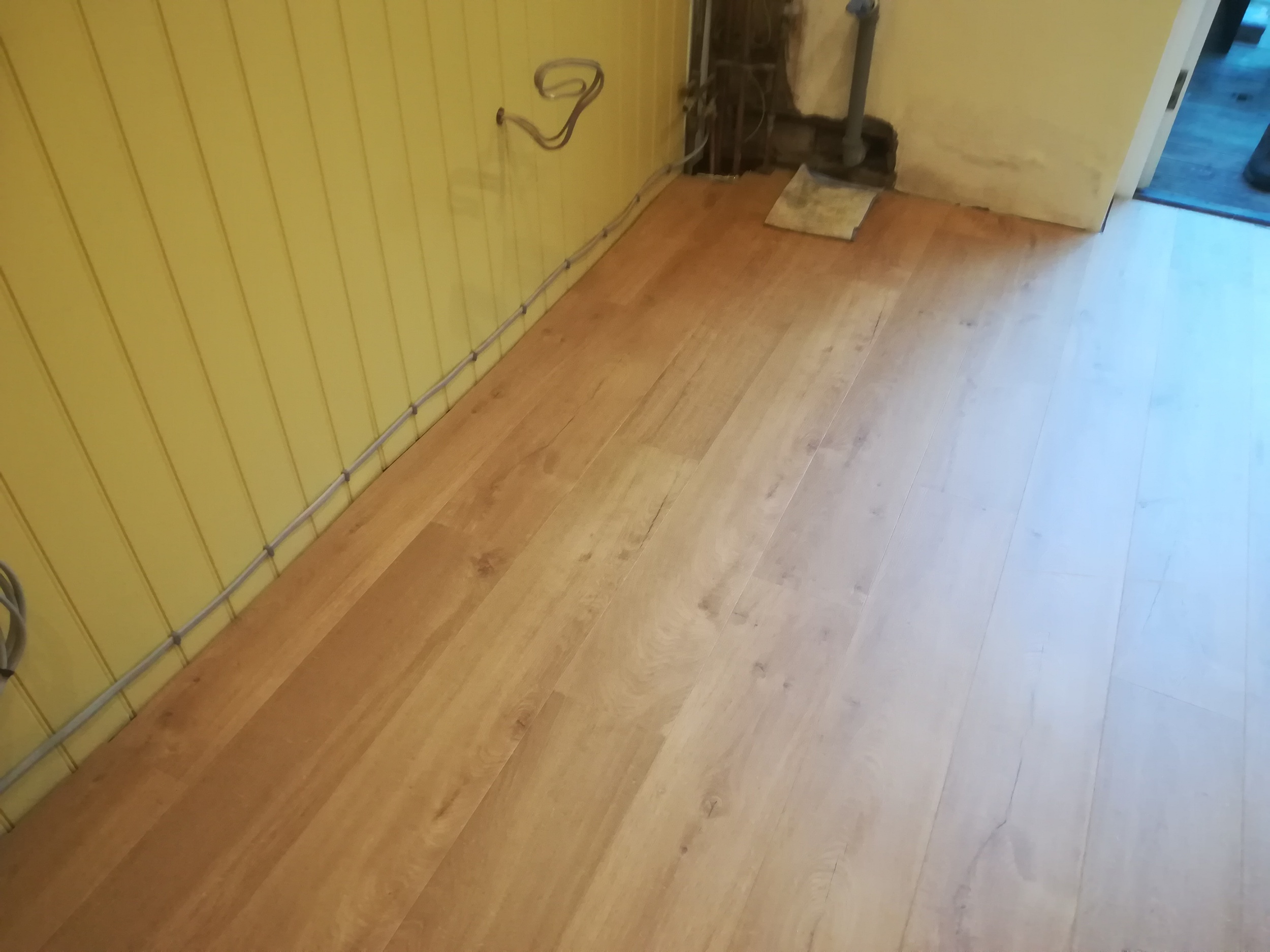 Private residence in County Durham. Preparation consisted of 6mm plywood. Floor covering was a 18mm solid wood in extra long planks measuring 2.2 meters in length and 20cm in width. Method of fixing was a full glue stick down of the wood.