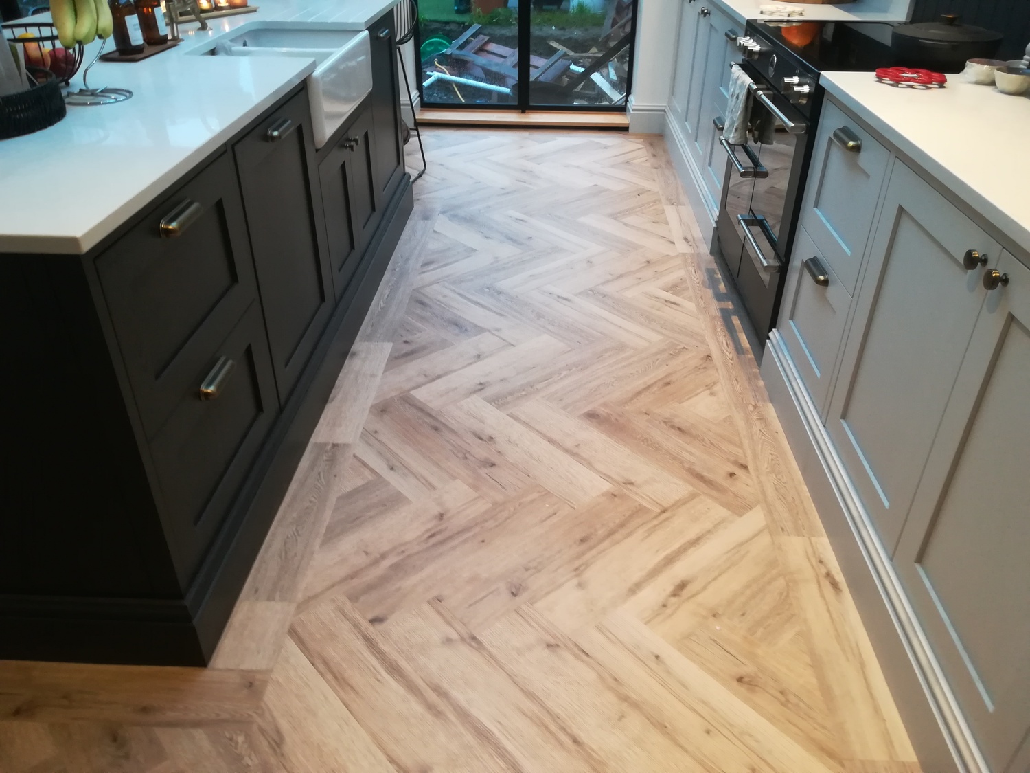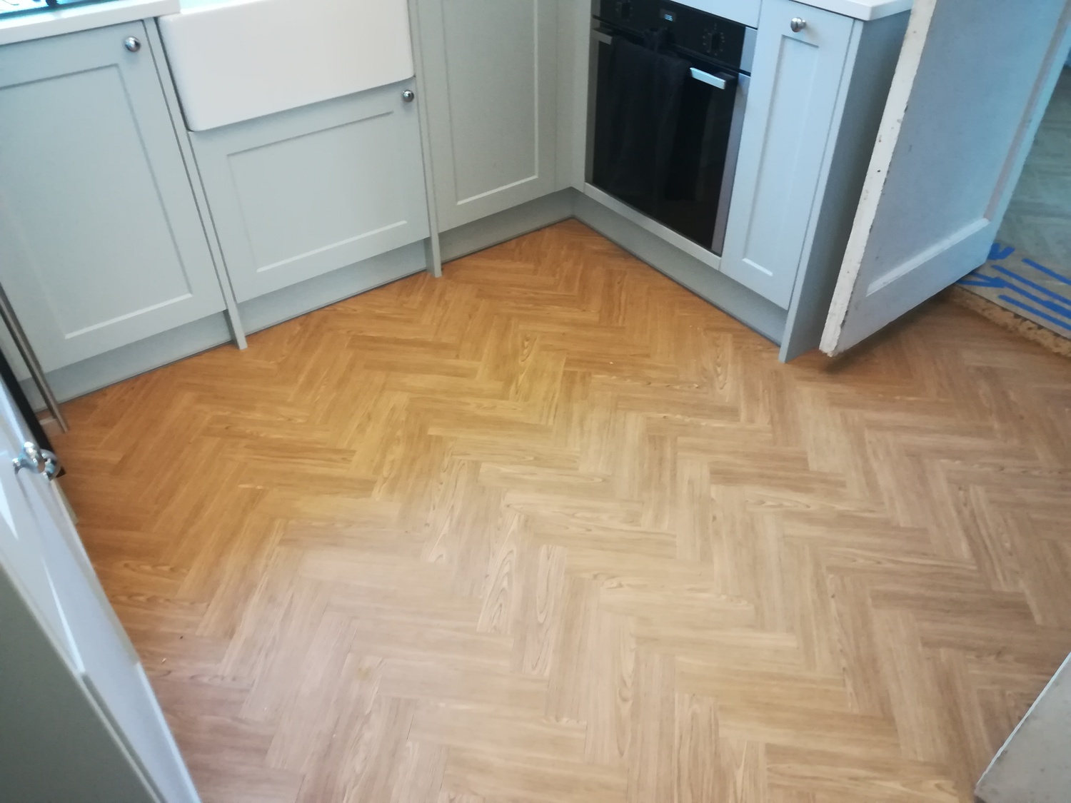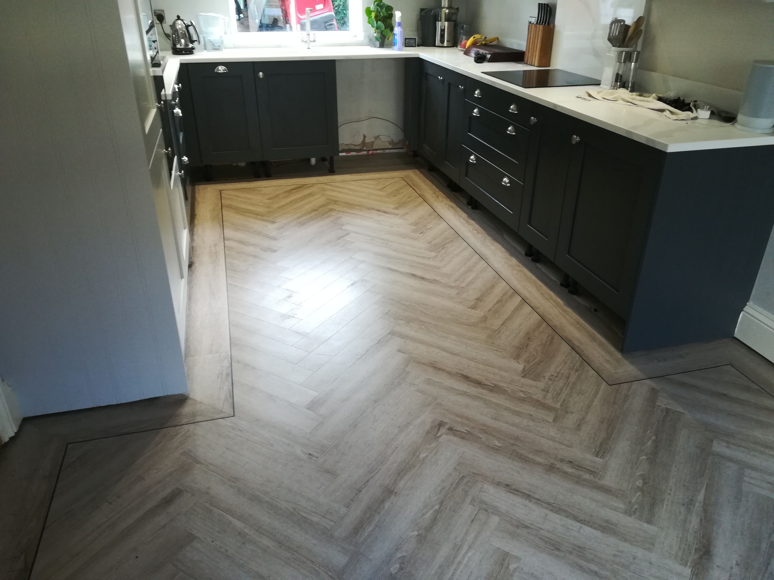 residence in Moulton. Client required a full uplift and screed of the kitchen. Then Polyflor Exempla in reclaimed oak was laid as a single plank border with a black feature strip. Then herringbone flooring was laid in the middle to finish of the look.