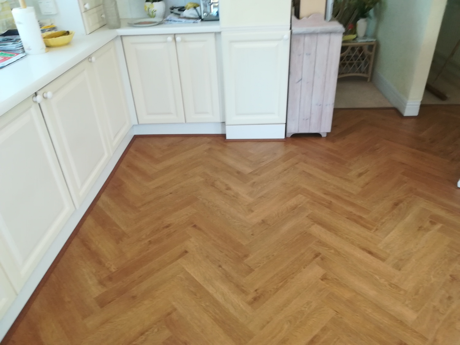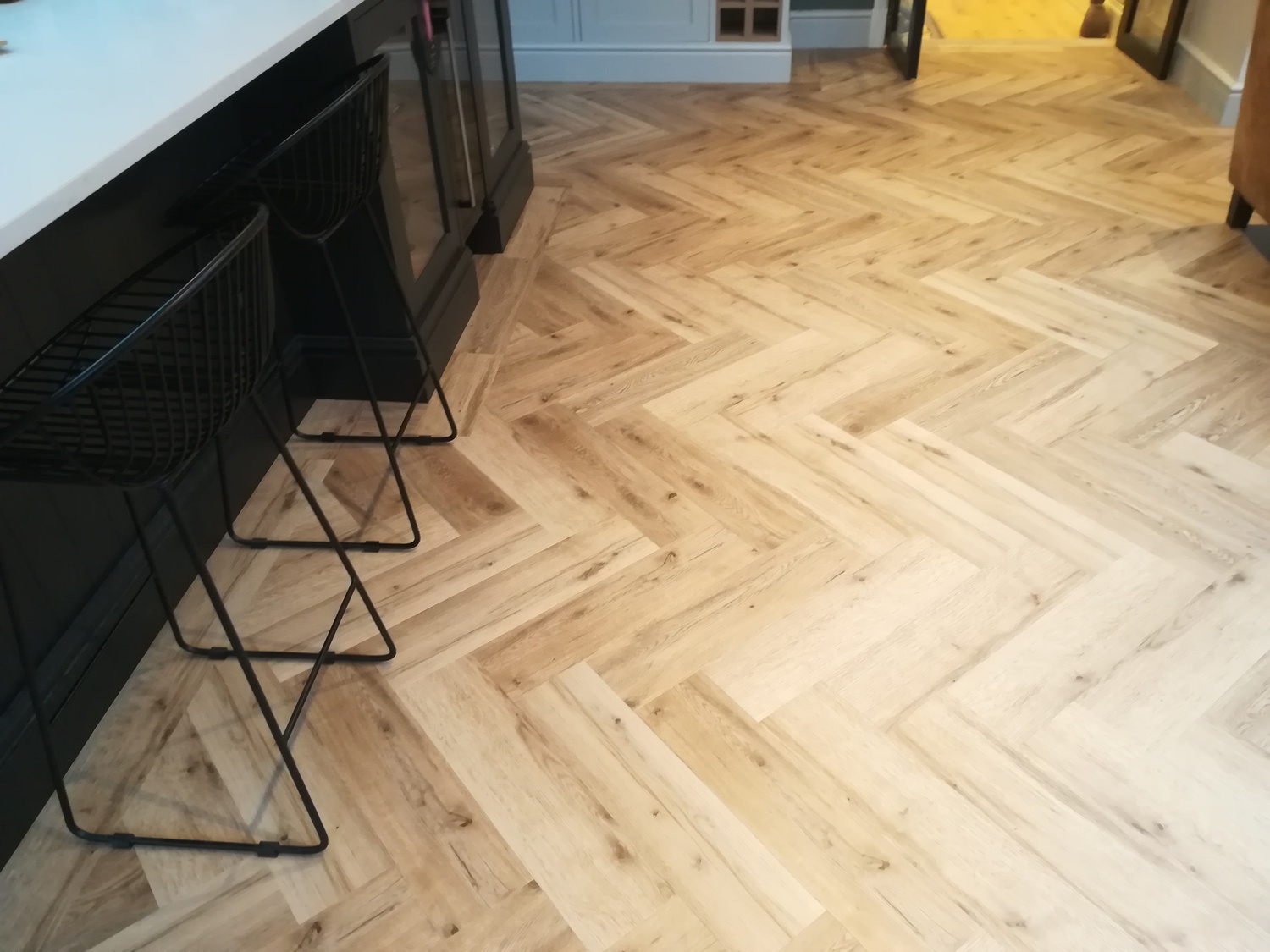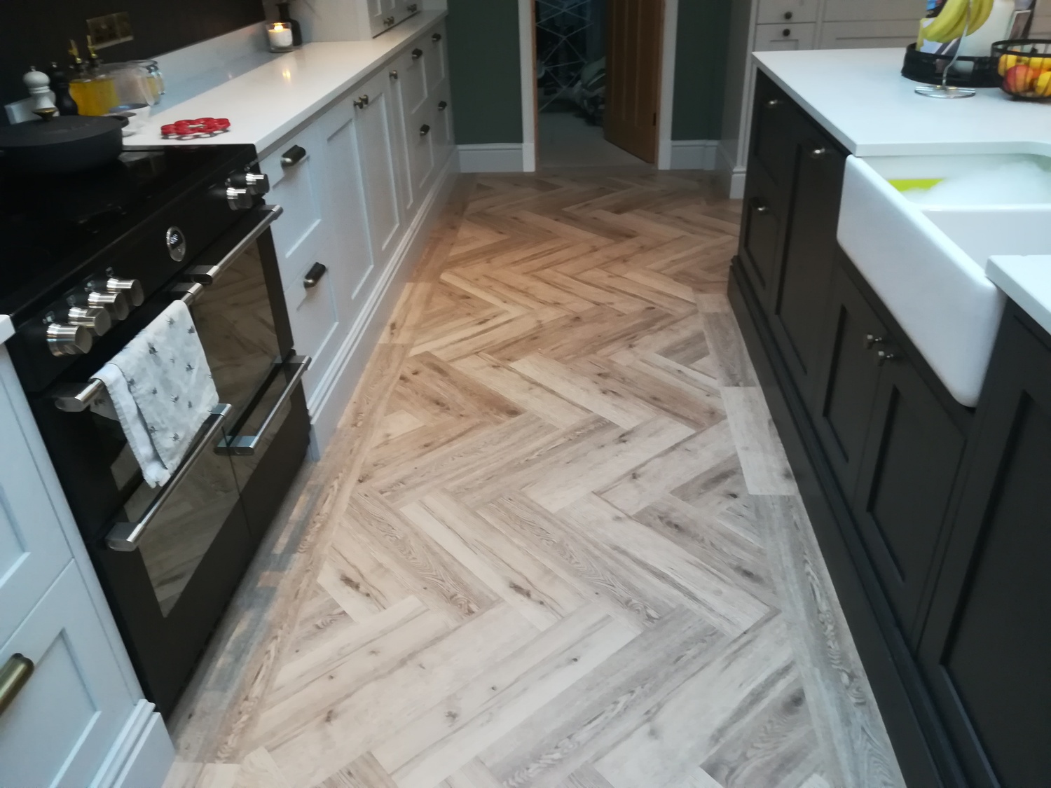 residence in Moulton. Client required a full uplift and screed of the kitchen. Then Polyflor Exempla in reclaimed oak was laid as a single plank border with a black feature strip. Then herringbone flooring was laid in the middle to finish of the look.