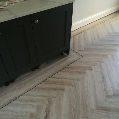 Residence in Moulton. Client required a full uplift and screed of the kitchen. Then Polyflor Exempla in reclaimed oak laid as a single plank border with a black feature strip. Then herringbone flooring laid in the middle to finish of the look.