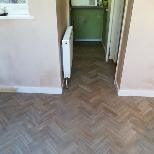 Private residence in South Shields. The client required the whole of the ground floor to be screed. Then to fit evocore herringbone throughout the hallway and living room. In the kitchen and downstairs toilet, tile effect was required. This product required a full stick down.