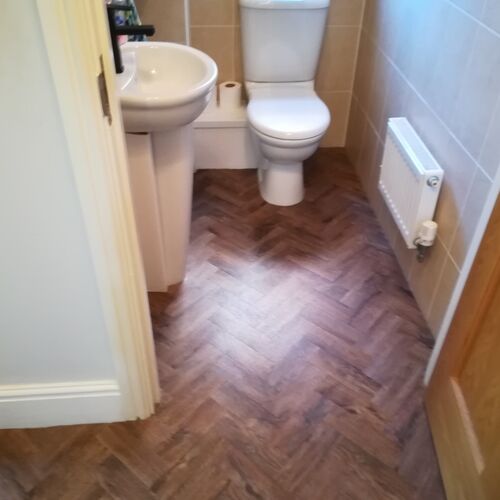 Private residence in Stanley. The client required the whole of the ground floor to be primed and screed. Then to supply and fit Polyflor parquet flooring with a full stick down . The client also required the flooring to flow through the entire ground floor with no breaks in the door ways. To complete the look the client supplied herringbone vinyl to be fitted in the upstairs bathroom and en-suite.