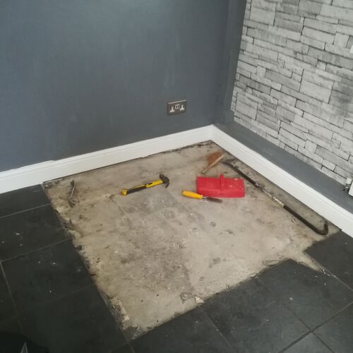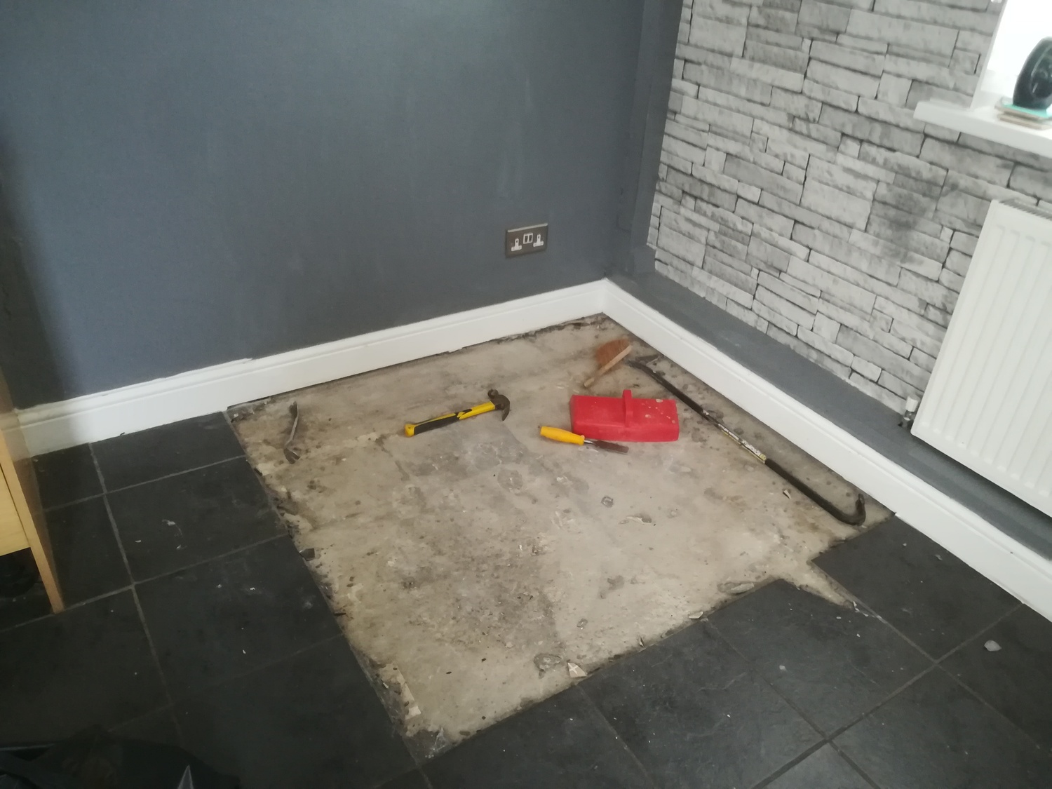 Private residence in South shields. Client required full uplift of ceramic tiles then the floor screed. Then to fit clients own vinyl with a full stick down.