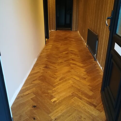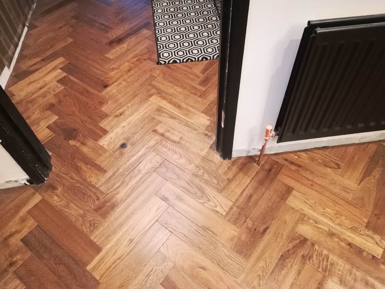 Residence in Durham. Screed and fit parquet flooring in the hallway, living room and the passage way.