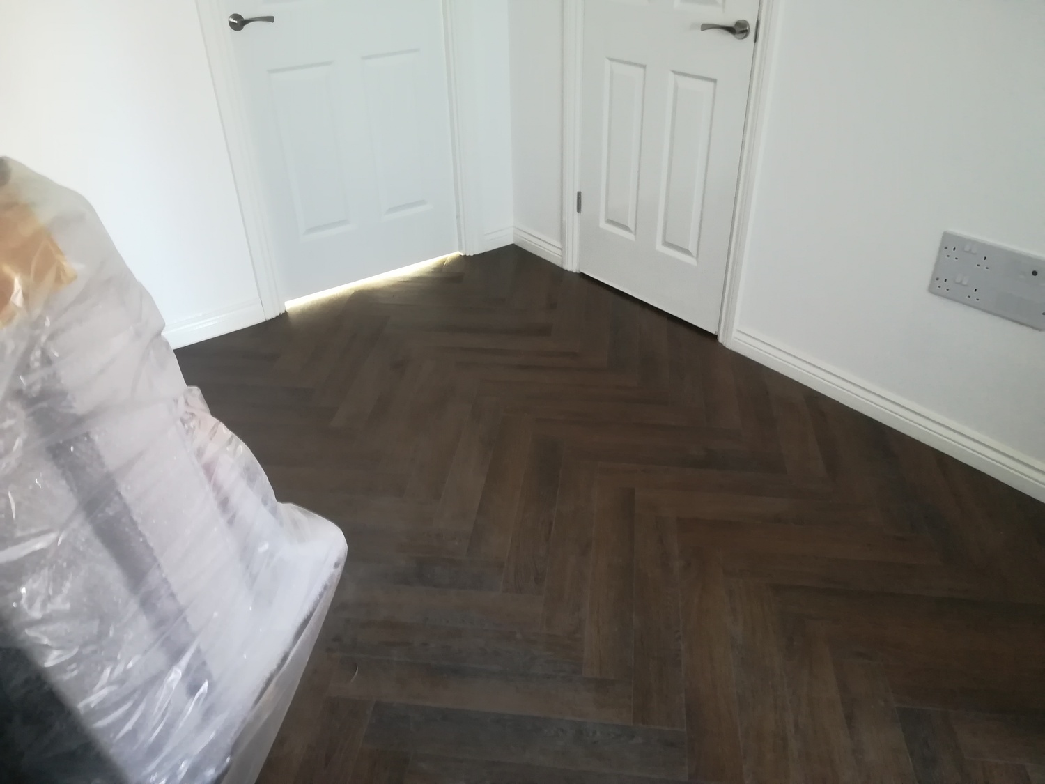 Private residence in Stanley. The client required the whole of the ground floor to be primed and screed. then to supply and fit Polyflor parquet flooring with a full stick down. the client also required the flooring to flow through the entire ground floor with no breaks in the door ways. To complete the look the client supplied herringbone vinyl to be fitted in the up stairs bathroom and en-suite.