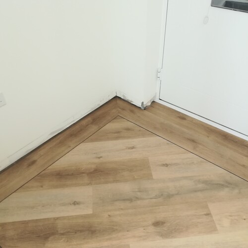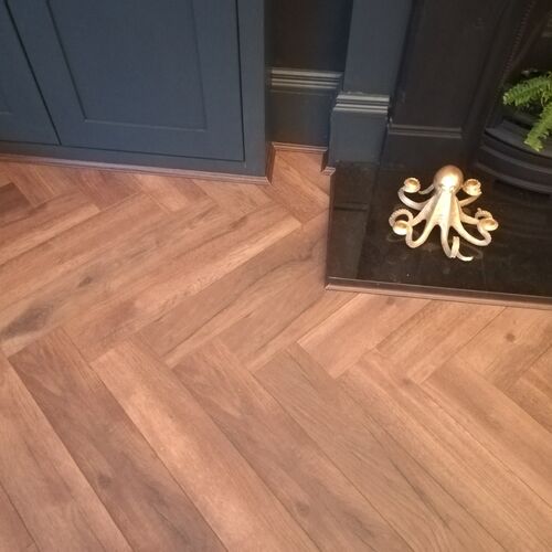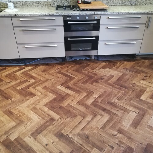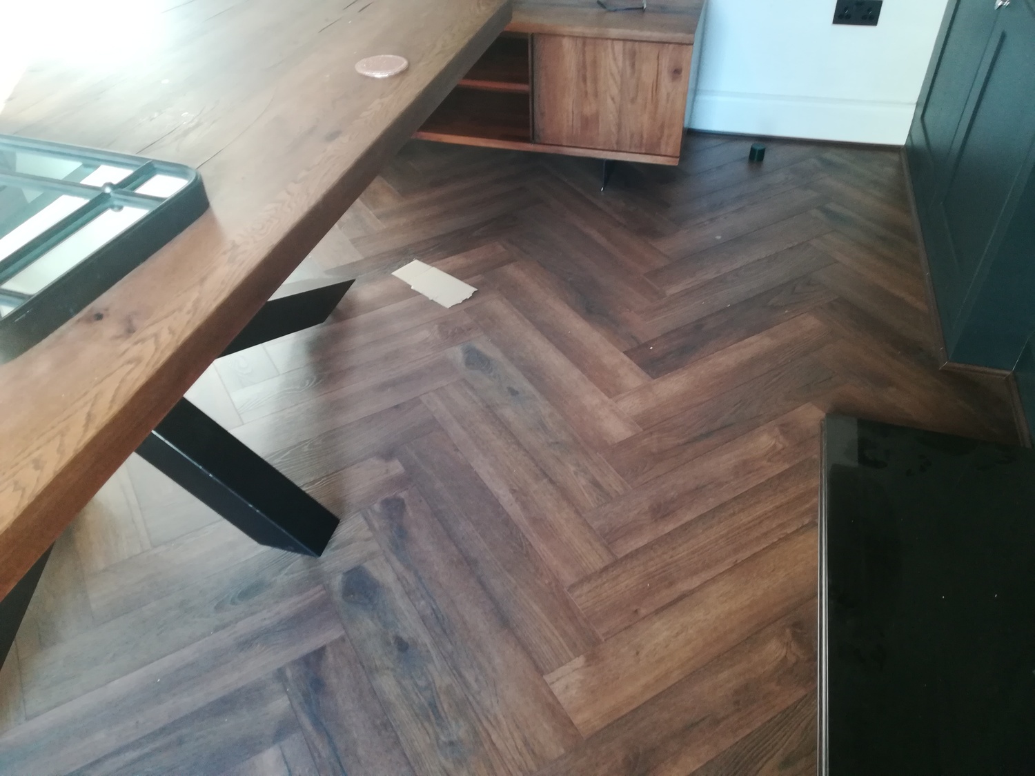 Residence in Moulton. Client required a full uplift and screed of the kitchen. Then Polyflor Exempla in reclaimed oak laid as a single plank border with a black feature strip. then herringbone flooring laid in the middle to finish of the look.