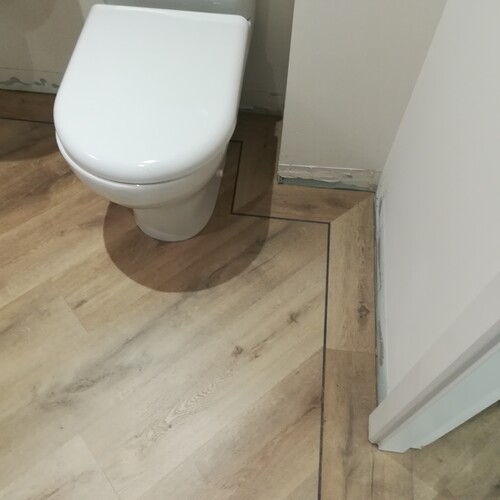 Private residence in Durham. With the toilet it was decided to leave the skirting boards on remove the toilet fit the laminate and refit the toilet. Then fit beading around the perimeter.